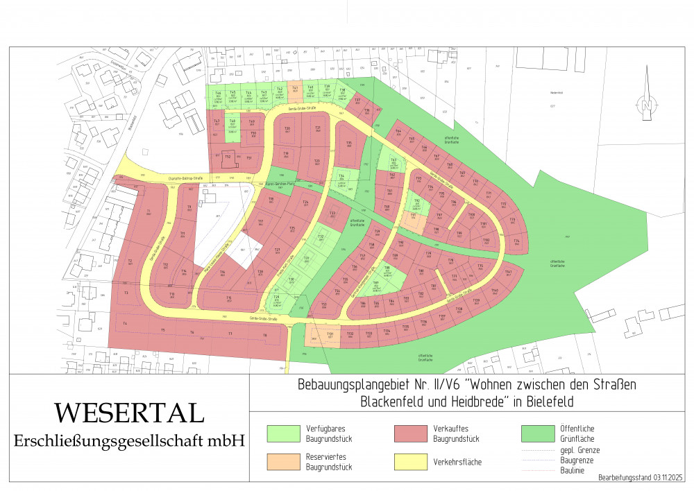 Der Bebauungsplan Nr. II/V6 "Wohnen zwischen den Straßen Blackenfeld und Heidbrede" wurde im Juni 2022 als Satzung beschlossen. Der notwendige Erschließungsvertrag mit der Stadt Bielefeld wurde Ende 2022 abgeschlossen.